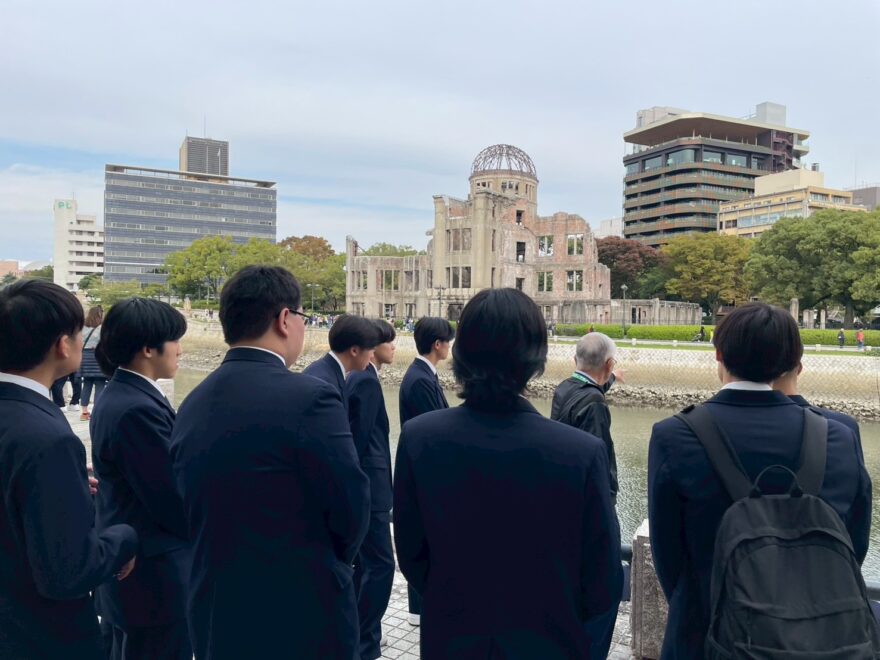 到着後はバスで「平和記念公園」へ向かい、原爆死没者慰霊碑の前で各クラスごとに戦没者への哀悼の意を表し、献花と黙祷を行いました。その後、広島平和記念資料館を見学し、展示資料を通して戦争の悲惨さや平和の尊さを改めて学びました。外国人観光客の姿も多く見られ、混雑する中でも生徒たちは落ち着いて見学をしていました。