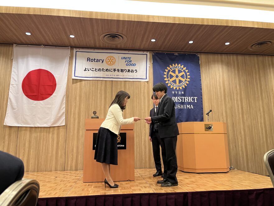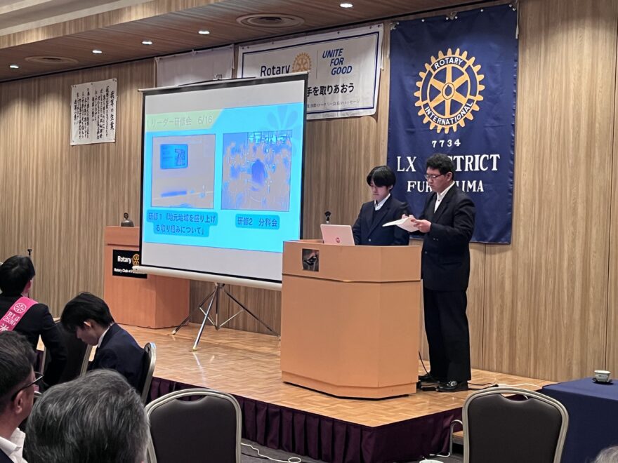3月12日(木)福島ロータリークラブの例会において、本校インターアクトクラブの2名(部長:吉橋青輝くん、副部長:齋藤寿遥くん)が今年度の活動報告をしました。