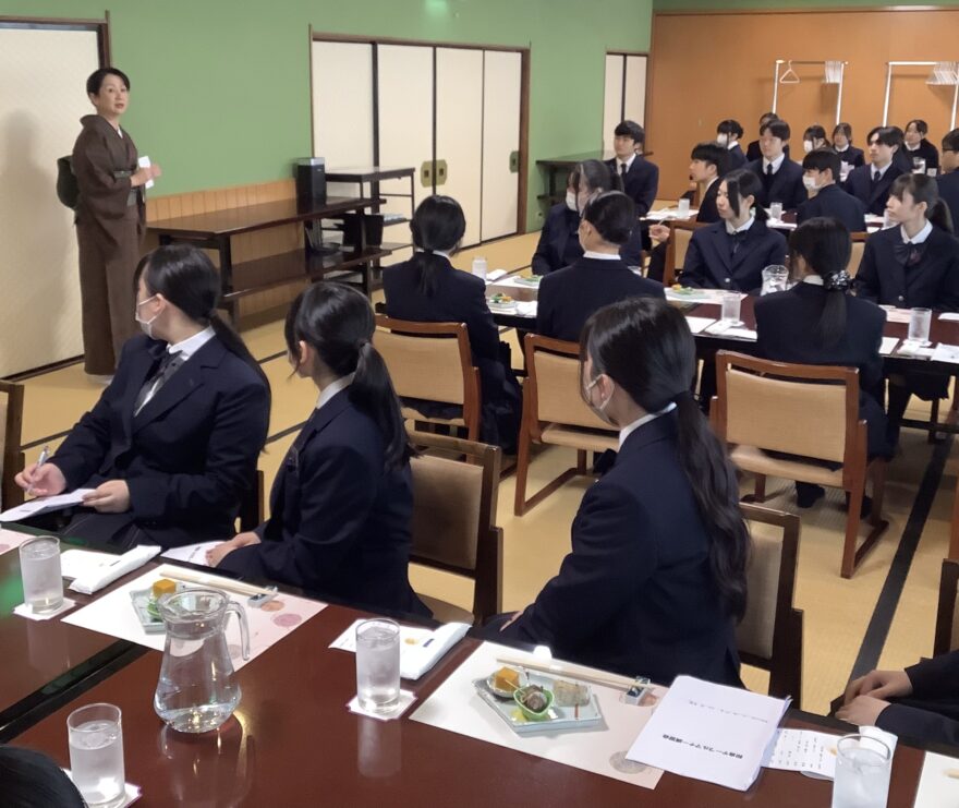 10月31日に食物文化科の1年生が、割烹『ますふじ』で和食のテーブルマナー講習会を行いました。今回は、お店からの提案で食材をクイズ形式で食材を当てながら料理をいただきました。生徒達からは『この食材はなにかな?』と悩みながらも、新たな発見を楽しみに、どれも丁寧な心遣いが詰まった料理に感動し、これからの学習に向け意欲が高まったようでした。また、卒業生も献立作成から料理の提供まで頑張ってくれる姿がみられ、人と人とのつながりを感じました。