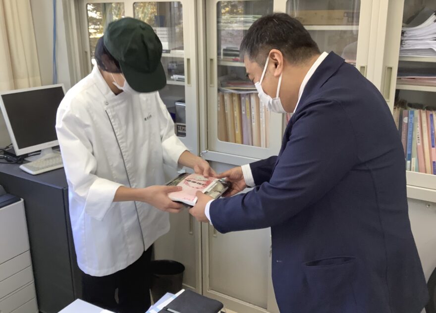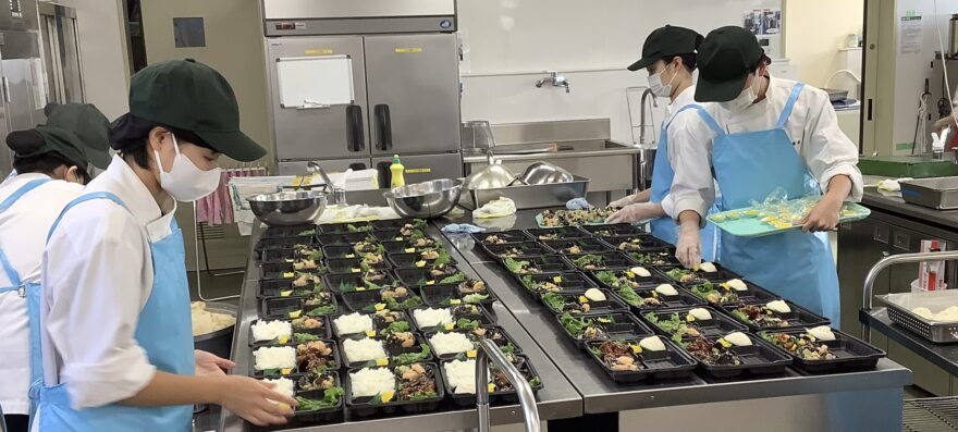 2学年の修学旅行に伴う特別時間割期間中(11月4日~7日)に、食物文化科3年生が3日間、総合調理実習の授業で、和食・洋食・中華の弁当を作りました。春の販売実習に続き2回目となり、手際よく自分たちで声をかけながら作業する姿に、これまでの学習の成果を感じることができました。出来上がった弁当は、生徒が作成した包装紙に包み、笑顔を添えてお届けしました。12月には、東稜マルシェで「オリジナル食肉惣菜」を販売する予定です。お楽しみに!