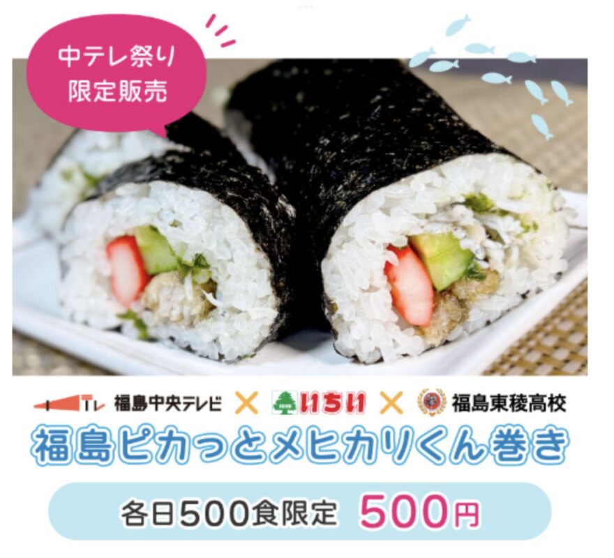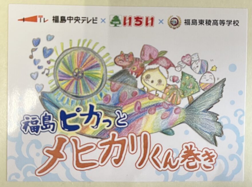 食物文化科2年生が考案した『福島ピカッとメヒカリ君巻き」が12月6・7日に郡山市のビックパレットで開催された『中テレ祭り」で販売されました。この企画は福島中央テレビと(株)いちい、そして本校の共同企画として、常磐物の美味しさを多くの人に知っていただきたいとの思いから、『メヒカリ」『アオサ」『じゃこ」を使って、手軽にワンハンドで食べて頂けるものを開発しました。イラストは中テレの井上アナウンサーとの共作で完成しました。当日は特設コーナーで販売され、2日間で1000食販売されました。今後の予定として、2月には、昨年に引き続き、いちいさんとのコラボで恵方巻が販売されます。お楽しみに!