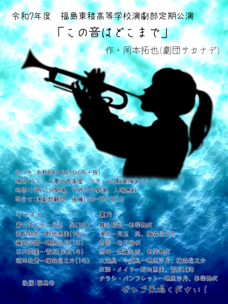 202601.15 演劇部 2/23(月・祝)に定期公演開催 演劇部です!演劇部は令和7年度の定期公演を2/23(月・祝)ふくしん夢の音楽堂小ホールにて14:10開場・14:30開演で行います。 今回は愛知県にある劇団サカナデさんの作品を上演させていただきます。熱血顧問が休職してしまった吹奏楽部を巡る物語です。 入場無料、駐車場もあります。上演時間は約1時間です。年に一度の定期公演、ぜひご来場ください!部員みんなで皆さんのことをお待ちしています!