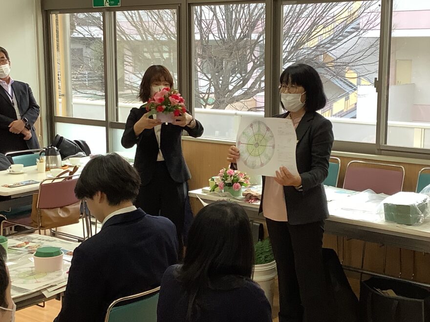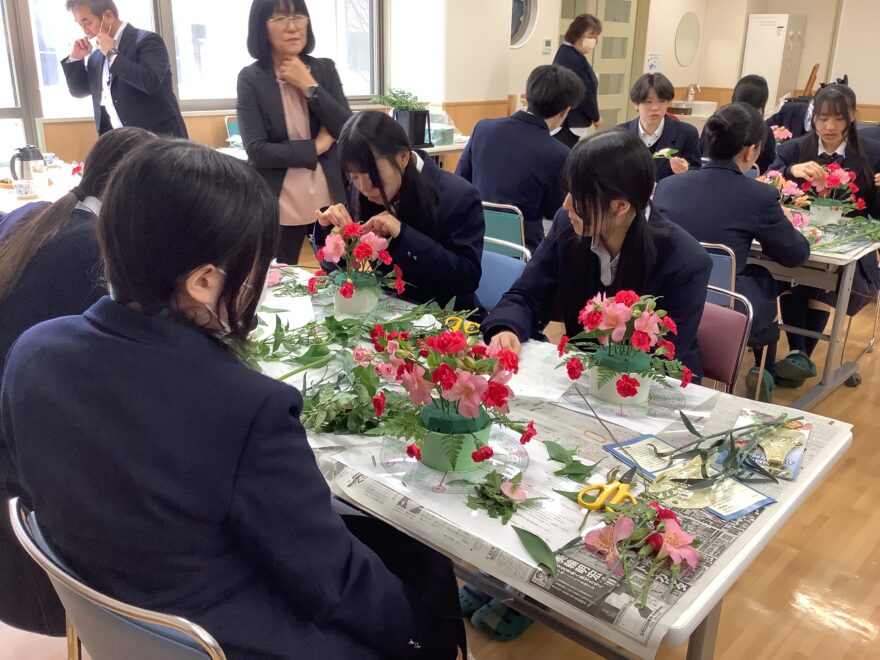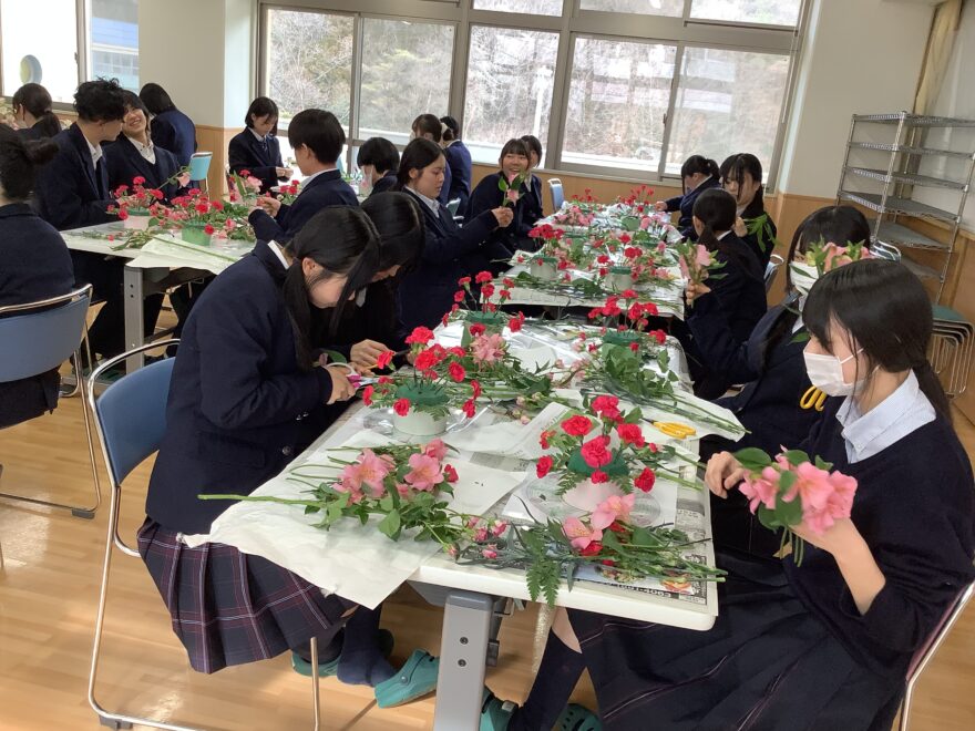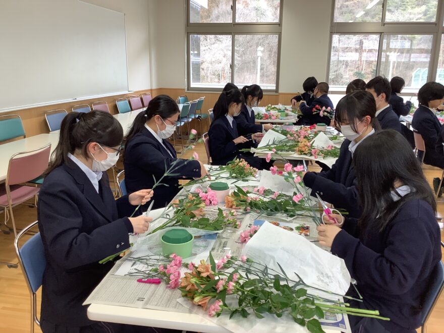 1月20日に、食物文化科3年生が『食卓を彩るテーブルコーディネート』学習のためにフラワーアレンジメント講習会を実施しました。福島市公設市場協会様の後援で市内の『ゆきフラワー』から2名の講師に来ていただき、楽しいひとときを過ごすことができました。3年間調理について学んできた3年生が、最後は料理をより美味しく演出する食卓を彩るお花について学び、調理師としての『ホスピタリティマインド』の大切さを再認識した一日でした。講師の先生から、食事は体の栄養で、お花は心の栄養になる。とのお話をいただき、卒業後の皆さんが、お花を愛でる心のゆとりを持てるような生活ができるようにと願うばかりです。